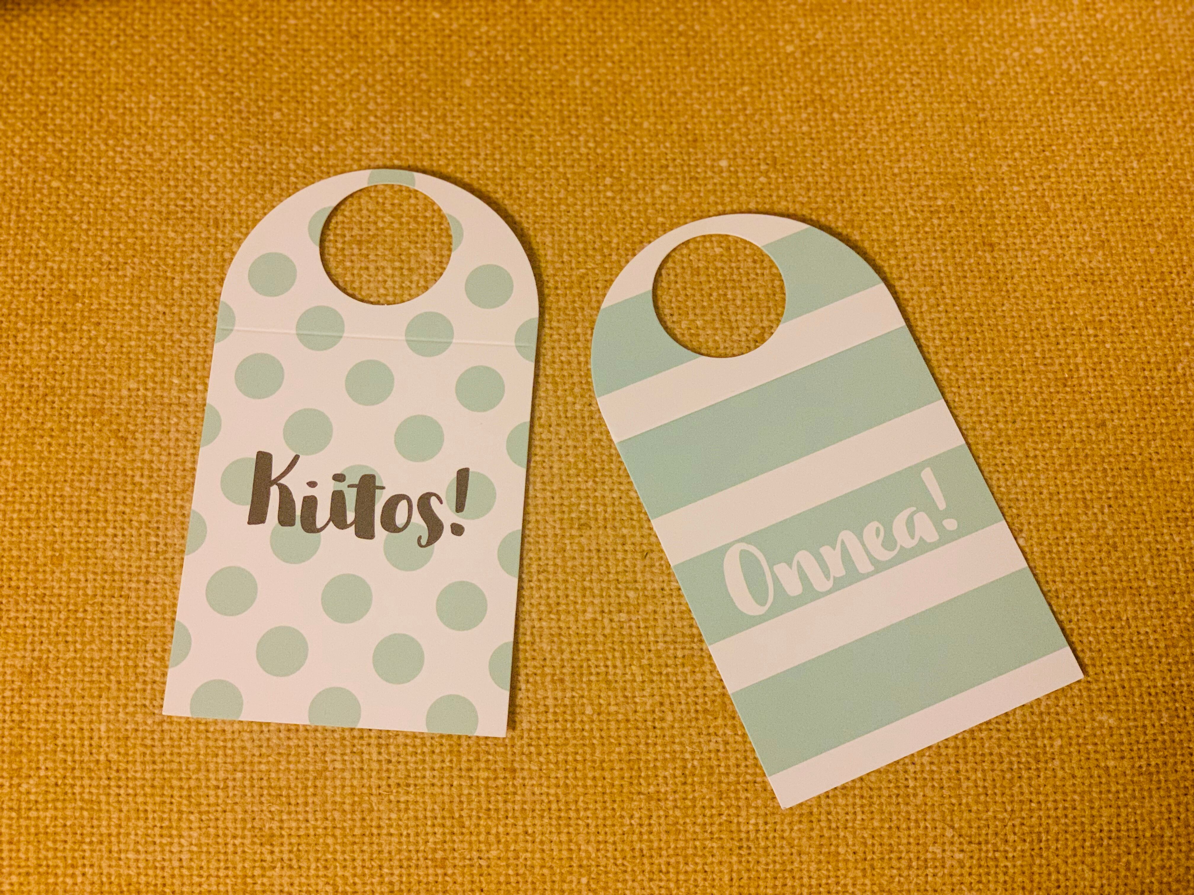 ミントグリーンのストライプにフィンランド語でおめでとう!お幸せに!という意味のonnea!の文字が書かれていてとてもかわいいです。
